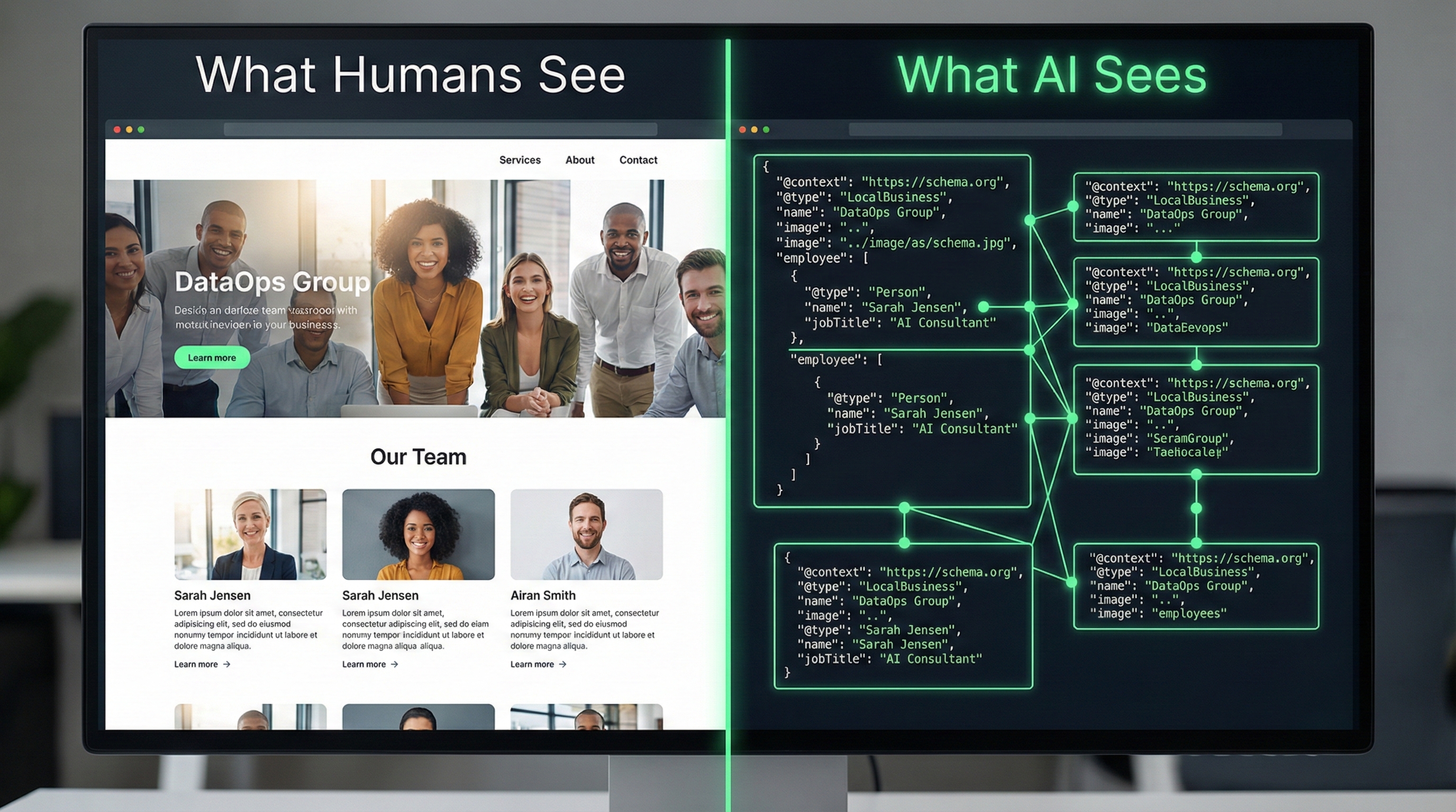 On the left is the Human UX you obsess over — nice photos, polished bios. On the right is the AI Comprehension layer you're completely ignoring — the invisible JSON-LD schema and structured data that actually determines whether AI models know you exist.